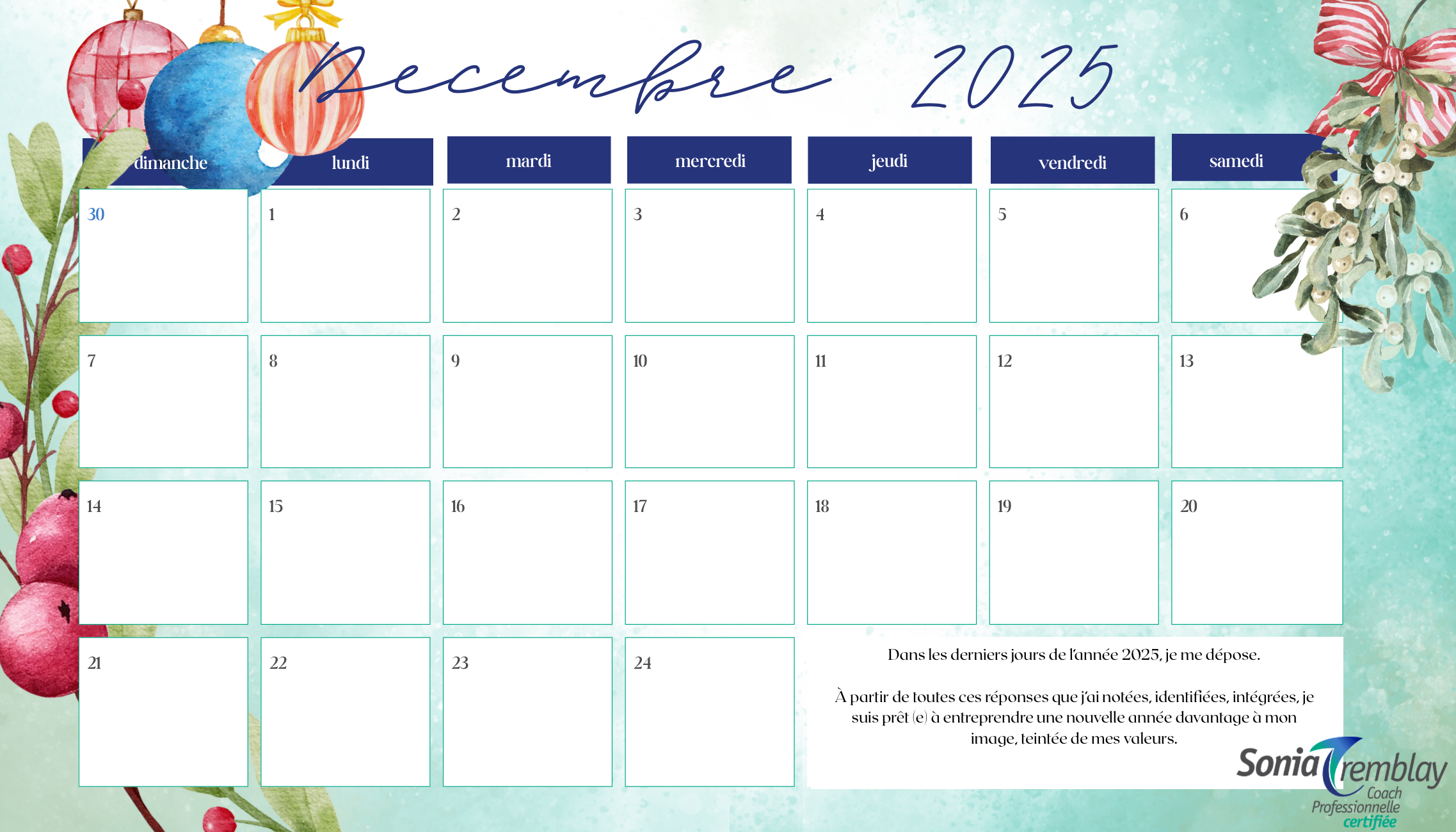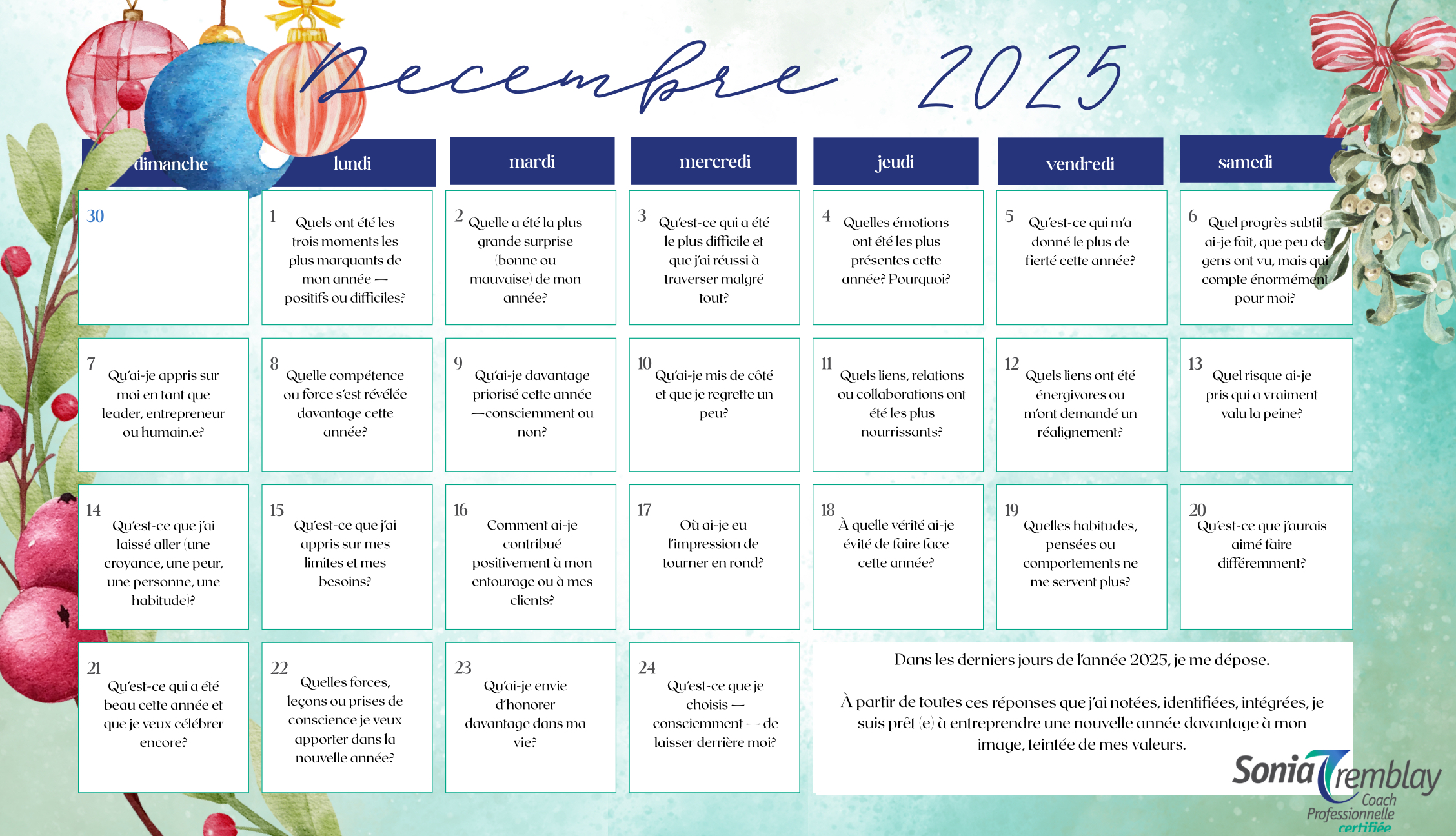 Pour la 9e année consécutive, je vous offre mon calendrier de l’Avent. Si les questions évoluent un peu au fil des ans, l’essence de l’exercice demeure inchangée: créer des moments de réflexion qui généreront des prises de conscience qui elles, à leur tour, vous guideront vers des pistes d’action pour l’année qui suivra.